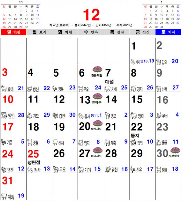벌써 23년 12월 마지막달 입니다. 한달 남은 2023년 마무리 잘하시길 바랍니다. 오늘은 12월 음력달력 불교달력 일진달력 간지달력을 올려드립니다.