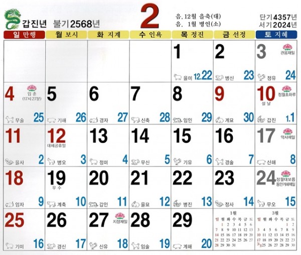 오늘은 2024년 2월 음력달력을 포스팅해봤습니다 :)