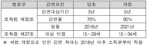 국세청에서는 중소기업에 입사한 청년이 소득세 감면을 받을 수 있는 '중소기업 청년 소득세 감면 제도'를 운영하고 있습니다. 이 제도는 2011년 12월 31일에 신설되어 몇 차례 세법 개정을 거쳐 일자리 대책의 일환으로 청년에 대한 세정지원 강화 뿐 아니라 고령자와 장애인, 경력 단절 여성까지 혜택을 제공하고 있습니다. 2018년 5월 29일 세법 개정으로 청년에 대한 세정지원이 더욱 강화되어서 돌려받을 수 있는 소득세의 금액이 늘어났습니다.