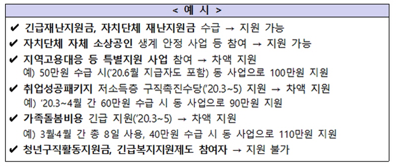 또한, 긴급재난지원 및 지자체 재난지원금 등 기존 사업과 중복 가능하며