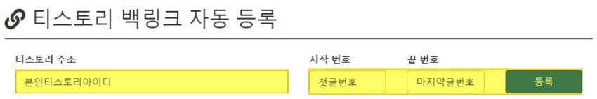 3. 티스토리 백링크 자동 등록 페이지가 뜨면 본인의 [티스토리 아이디]를 입력 후 우측에 블로그 글번호의 시작번호와 끝번호를 입력하고 등록버튼을 클릭합니다. (본인 블로그 방문 후 첫 글과 마지막 글을 방문하면 URL로 확인할 수 있습니다.)