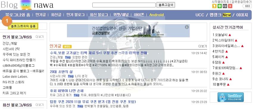 2. 좌측상단의 [블로그/트위터 등록] 버튼 클릭