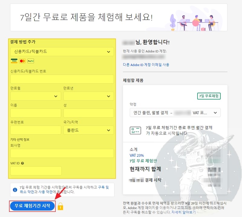 본인의 결제정보를 입력후 [무료 체험기간 시작]을 클릭 후 다음단계로 넘어가시면 됩니다.