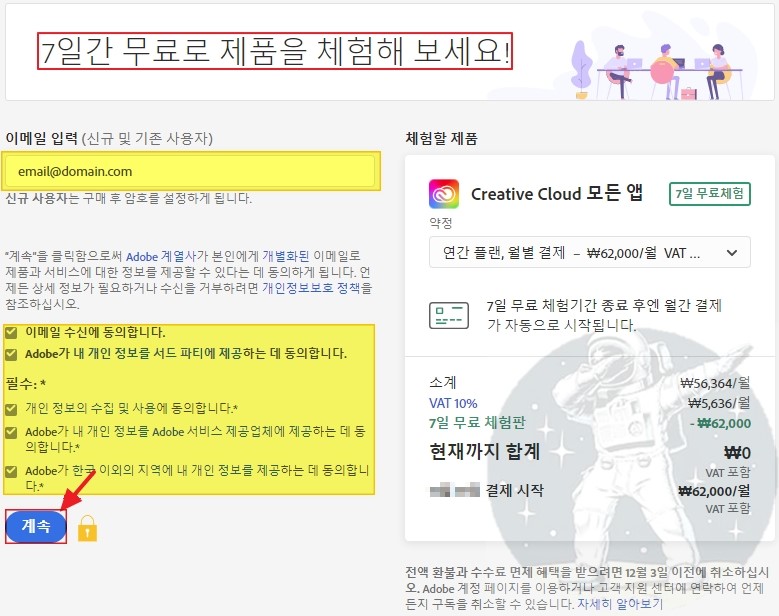 가입 이메일 주소를 입력 후 아래 체크박스를 선택하고 [계속] 버튼을 눌러 다음단계로 넘어갑니다.
