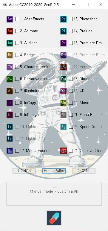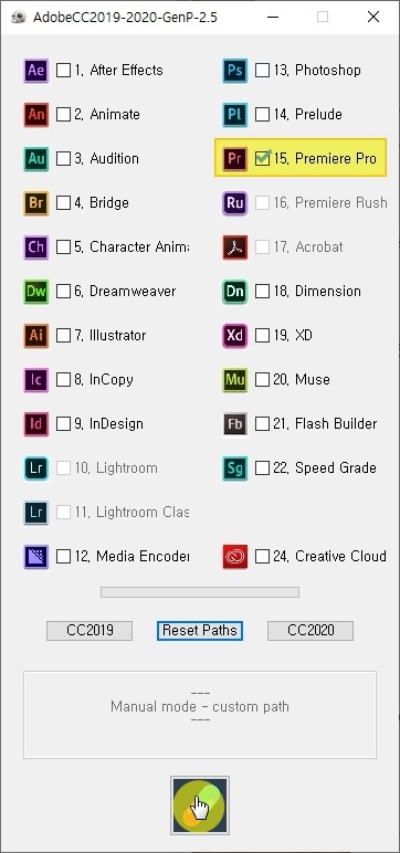 GenP가 실행되면 15. Premiere Pro(프리미어프로) 체크 후 제일 하단의 알약버튼을 클릭 합니다.